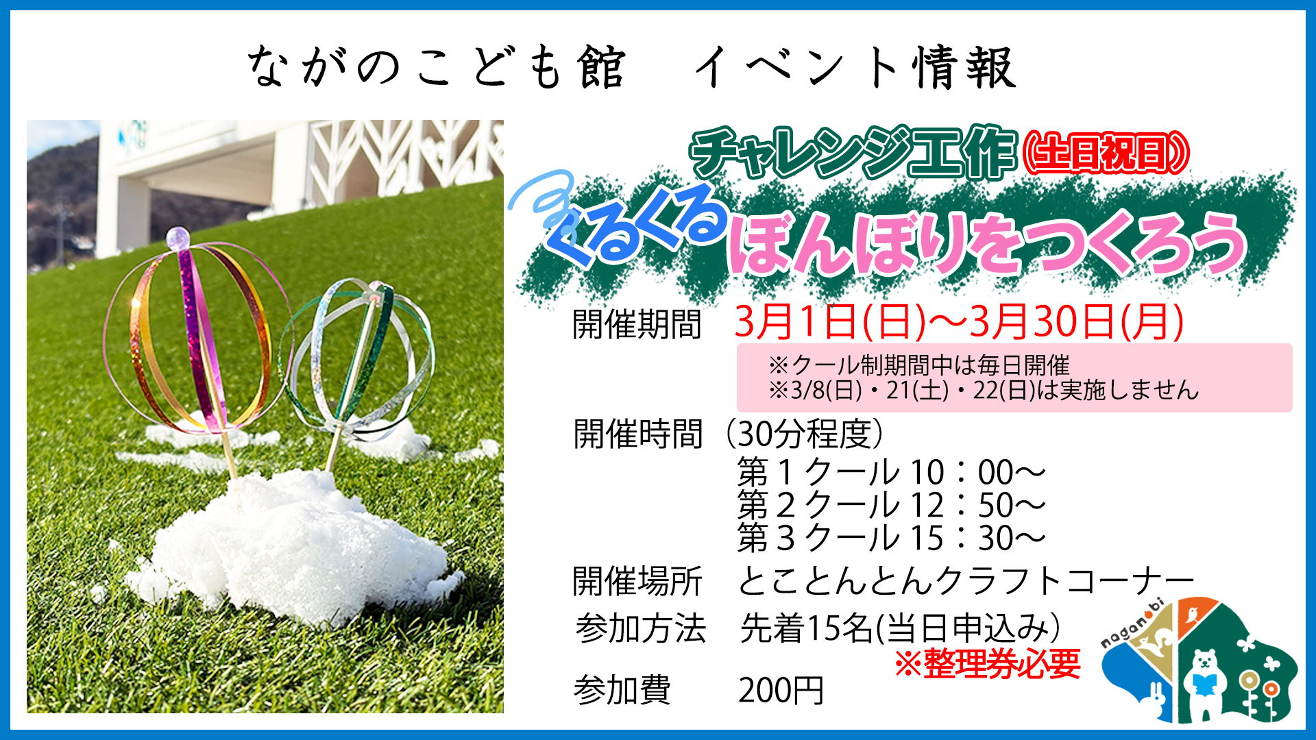 また、3/8(日)、3/21(土)、3/22(日)は開催しません。