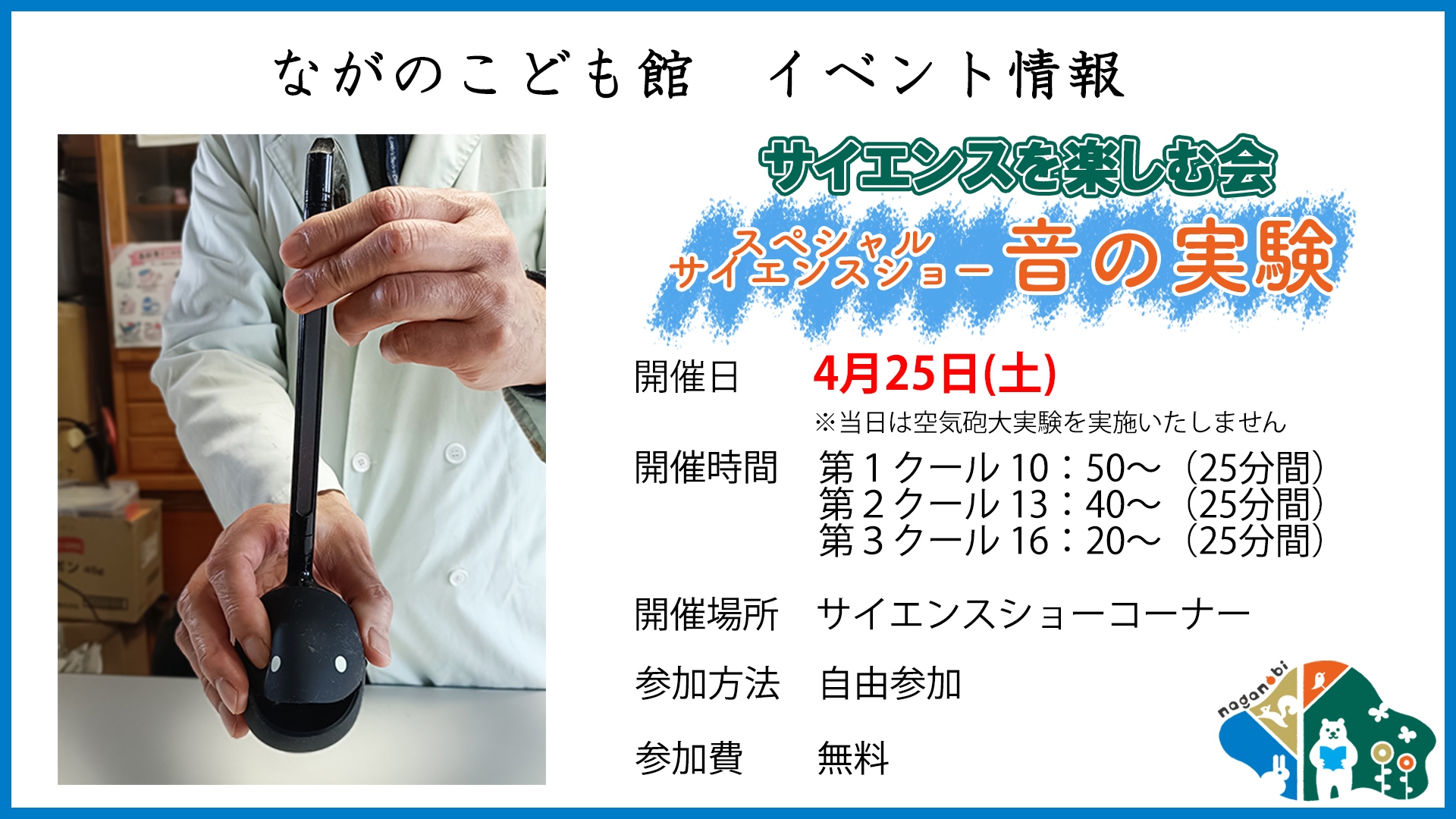 4/25(土)はサイエンスを楽しむ会の大原先生をお招きして「音の実験」サイエンスショーを実施いたします。
