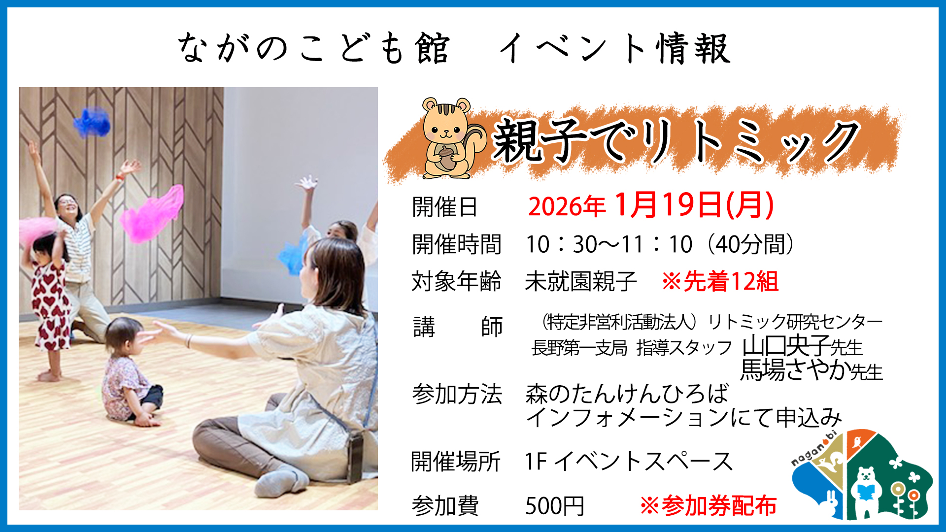 体を動かしながらリズムで遊んで、一緒に歌ったり踊ったり楽しい時間を過ごしましょう!