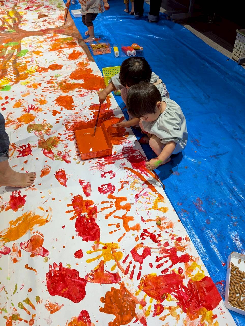 幹だけ描いた大きな紙に、手でペッタン!両足に絵の具を付けてトコトコ…足型をつけたり、筆で描いてみたり。 みるみる秋の木に変身! みんなで描いた素敵な作品は、 森のたんけんひろば奥の廊下に展示してあります。 ぜひ見に来てね♪