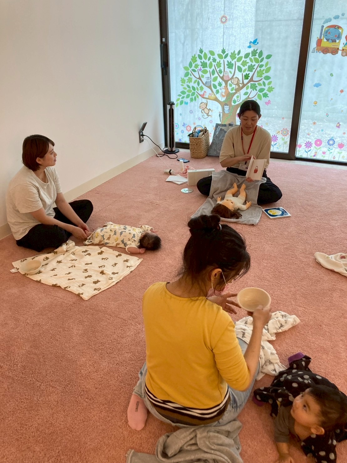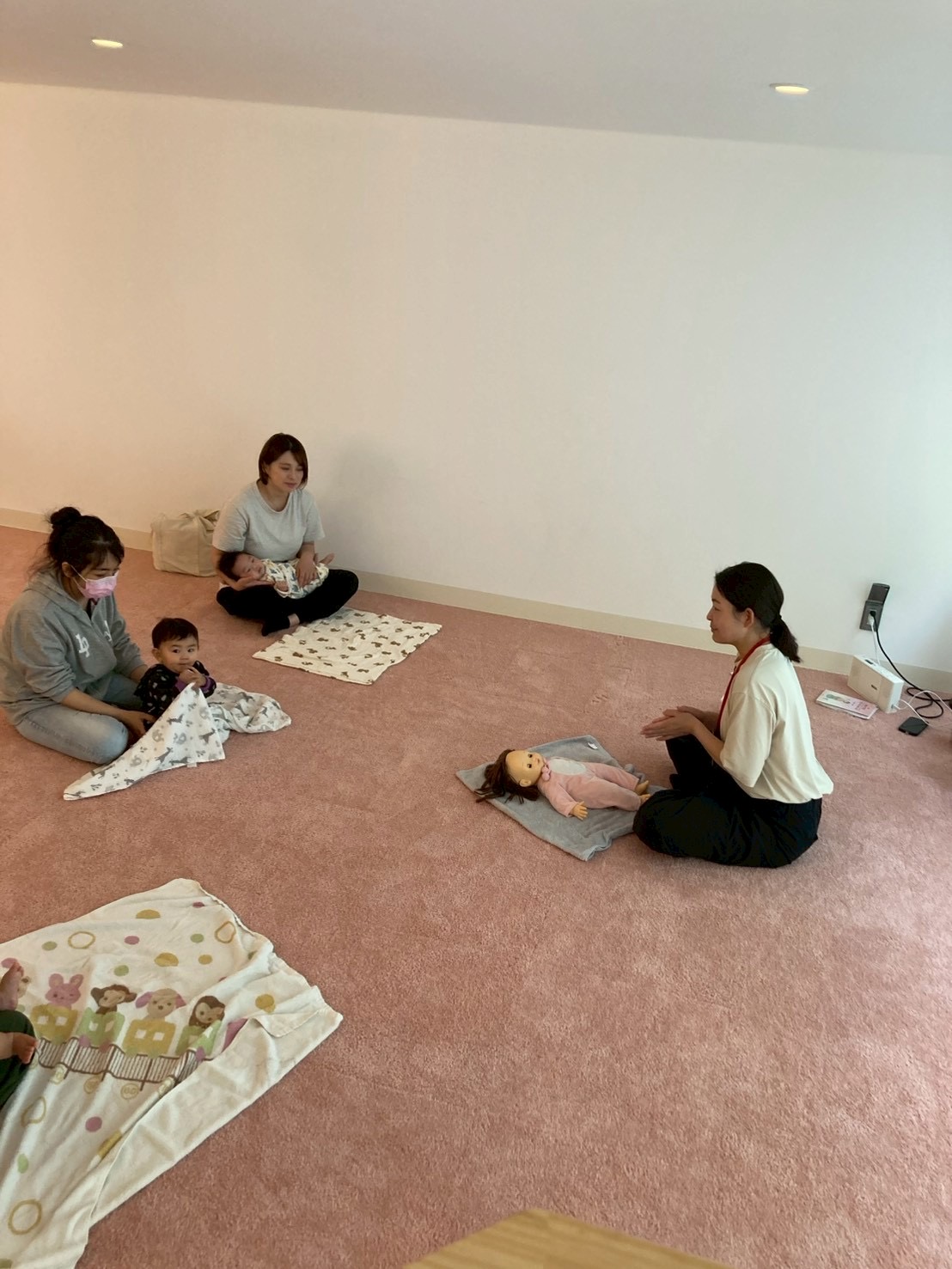 今回は、初めて地下の「赤ちゃんねんね」のコーナーで行いました。 柔らかいじゅうたんの区切られた空間で、お互いの距離も近くゆったり過ごしていました♪