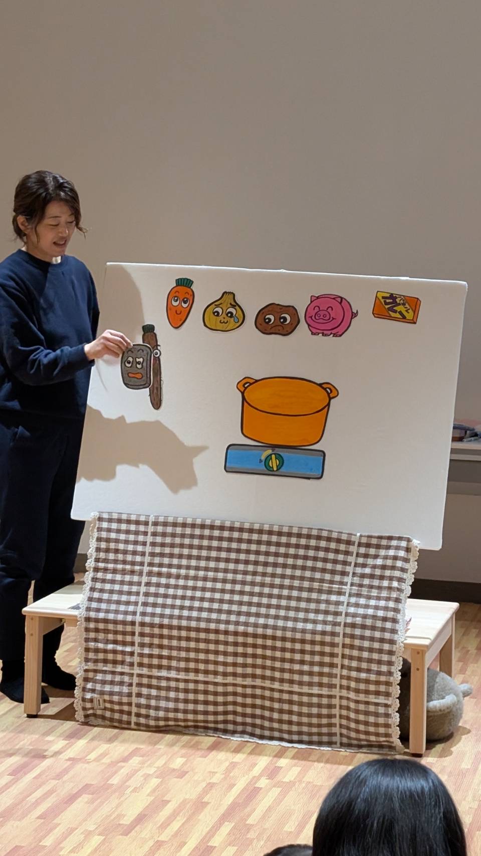パネルシアターでは 人参・玉ねぎ・ジャガイモ・豚肉‥‥ 今日はゴボウやこんにゃくを入れて「豚汁」にしました。